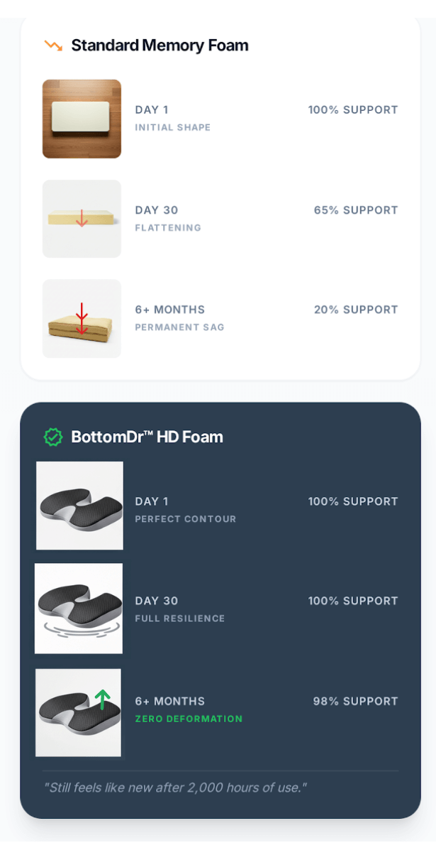 Truckers, delivery drivers, rideshare pros. If sitting is your job, failing equipment isn't an option. BottomDr is built for the long haul because you are.